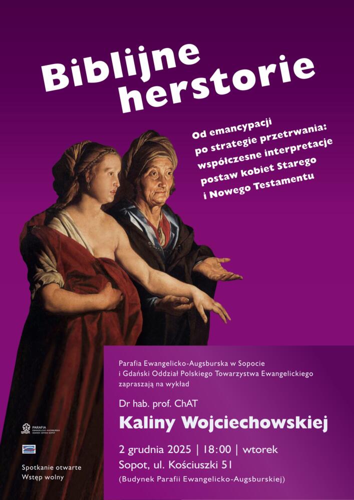 We wtorek 2 grudnia 2025 r. o godzinie 18.00 Parafia Ewangelicko-Augsburska i gdański Oddział Polskiego Towarzystwa Ewangelickiego w Sopocie zapraszają na wykład dr hab. prof. ChAT Kaliny Wojciechowskiej pod tytułem „Biblijne herstorie. Od emancypacji po strategie przetrwania: współczesne interpretacje postaw kobiet Starego i Nowego Testamentu”. Wykład odbędzie się w sali na Plebanii, przy ul. Kościuszki 51 w Sopocie.