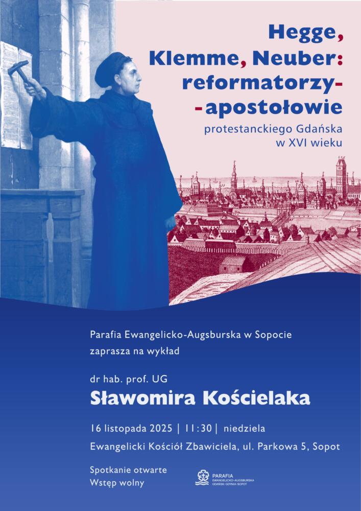 Po niedzielnym nabożeństwie, 16 listopada 2025 r. o godz. 11:30, serdecznie zapraszamy do Kościoła Zbawiciela w Sopocie na wykład dr. hab. prof. UG Sławomira Kościelaka poświęcony początkom Reformacji w Gdańsku i działalności trzech pierwszych kaznodziejów protestanckich miasta – Johanna Heggego, Jakuba Klemmego i Johanna Neubera.