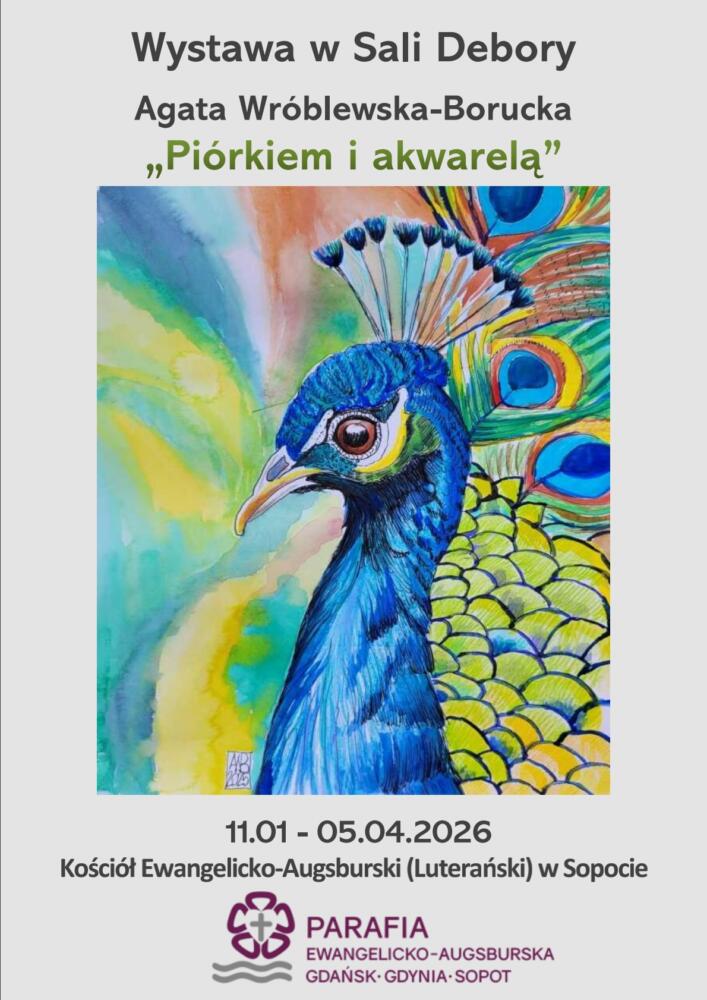 W Sali Debory w ewangelickim kościele Zbawiciela w Sopocie prezentowana będzie wystawa prac Agaty Wróblewskiej-Boruckiej zatytułowana „Piórkiem i akwarelą”. Inicjatorem i pomysłodawcą wystawy jest p. Szymon Mielczarek, któremu serdecznie pragniemy w tym miejscu podziękować.
